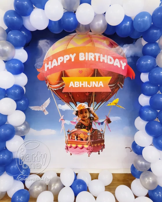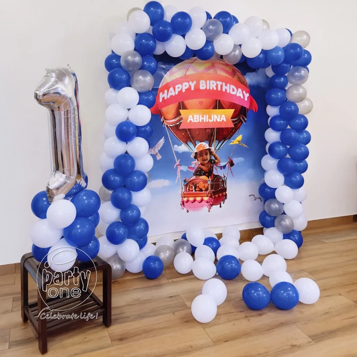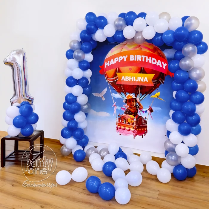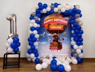 • Ready to take your party to new heights? PartyOne makes it possible with our Hot Air Theme Flex Birthday Decoration in Thane to make your celebration sky-high spectacular! Featuring a 5×5 ft hot air theme flex backdrop personalized with your baby's name, this decoration is perfectly curated by PartyOne professional decorators. The stunning balloon arch with blue, white, and metallic grey balloons adds a whimsical touch that’s simply unbeatable, resembling the sky. With a customizable digit number silver foil balloon topped on a 2 ft balloon pillar, your party is set to soar. Additionally, 20 loose balloons on the floor ensure endless fun and spontaneous balloon battles. Don’t just throw a party—throw the best bash in town with this high-flying decor! Choose PartyOne — For setting up the perfect ambience and letting you have a laid-back celebration and enjoy a lovely and memorable birthday bash and score that streak worthy snaps! For a smooth celebration, have a reliable power supply and allocate PartyOne balloon decorators 3 hours prior to the event for everything to come together.