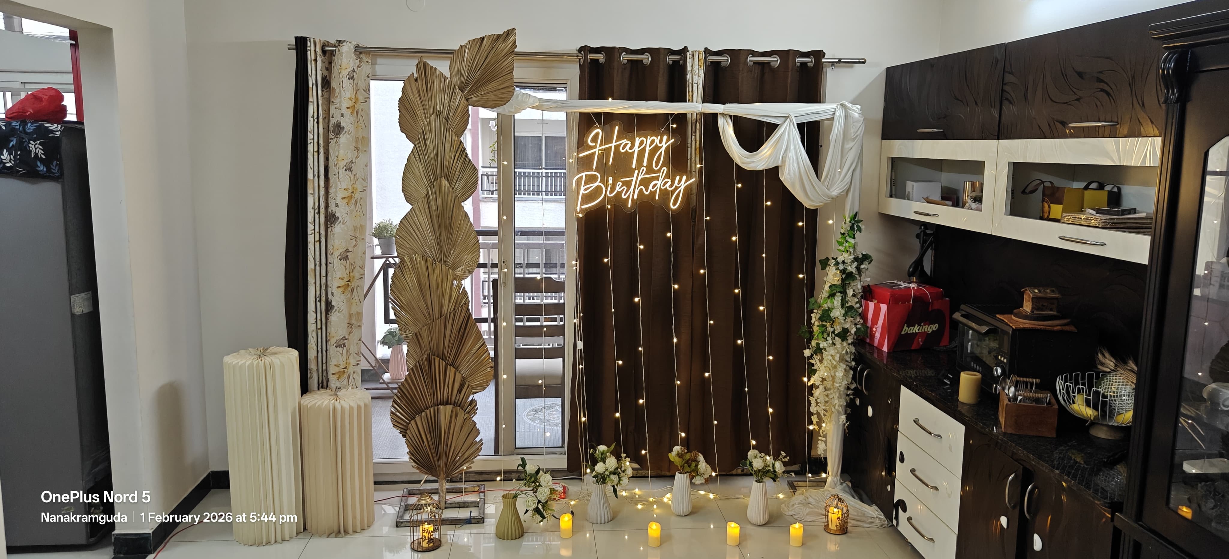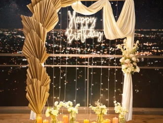 • Turn that terrace into a party zone of the highest degree with our PartyOnes’ Moonlit Moments Surprise Terrace Decoration in Thane! This is kinda like throwing a birthday party in a tropical paradise—just, you know, without the sunburn. So imagine chennayil or anywhere: an epic 6x6 ft iron stand decked with a neon "Happy Birthday" light so bright it could quite possibly be seen from space—that's how bright it is (NASA might just call you). Wrap it in cascading white fabric to get that oh-so-cohesive look going for your setup even though you forgot about the party until yesterday. But hey, there's more glam in here! Two fab faux gold palm leaves for the touch that makes everybody feel they walked onto set—lights, camera, action! It has an eclectic bunch of flowers and four chic non-glass vases which convey elegance without breaking any of your guests' toes during cleanup. Lit up the night with ten big electric candles because who needs real flames when you can have a burning, magical flame? Plus, we threw in some dazzling serial lights for that extra sparkle; think fairy tale but without all those pesky fairies trying to steal your thunder. Yes, two cages are included because every great decor deserves a little mystery… or maybe just somewhere to stash snacks away from sneaky guests! Get ready to throw the most memorable soirée possible, where you're sure to laugh the night away and hopefully have zero regrets! Book now from PartyOne before someone else beats you to it—or worse—your cake!