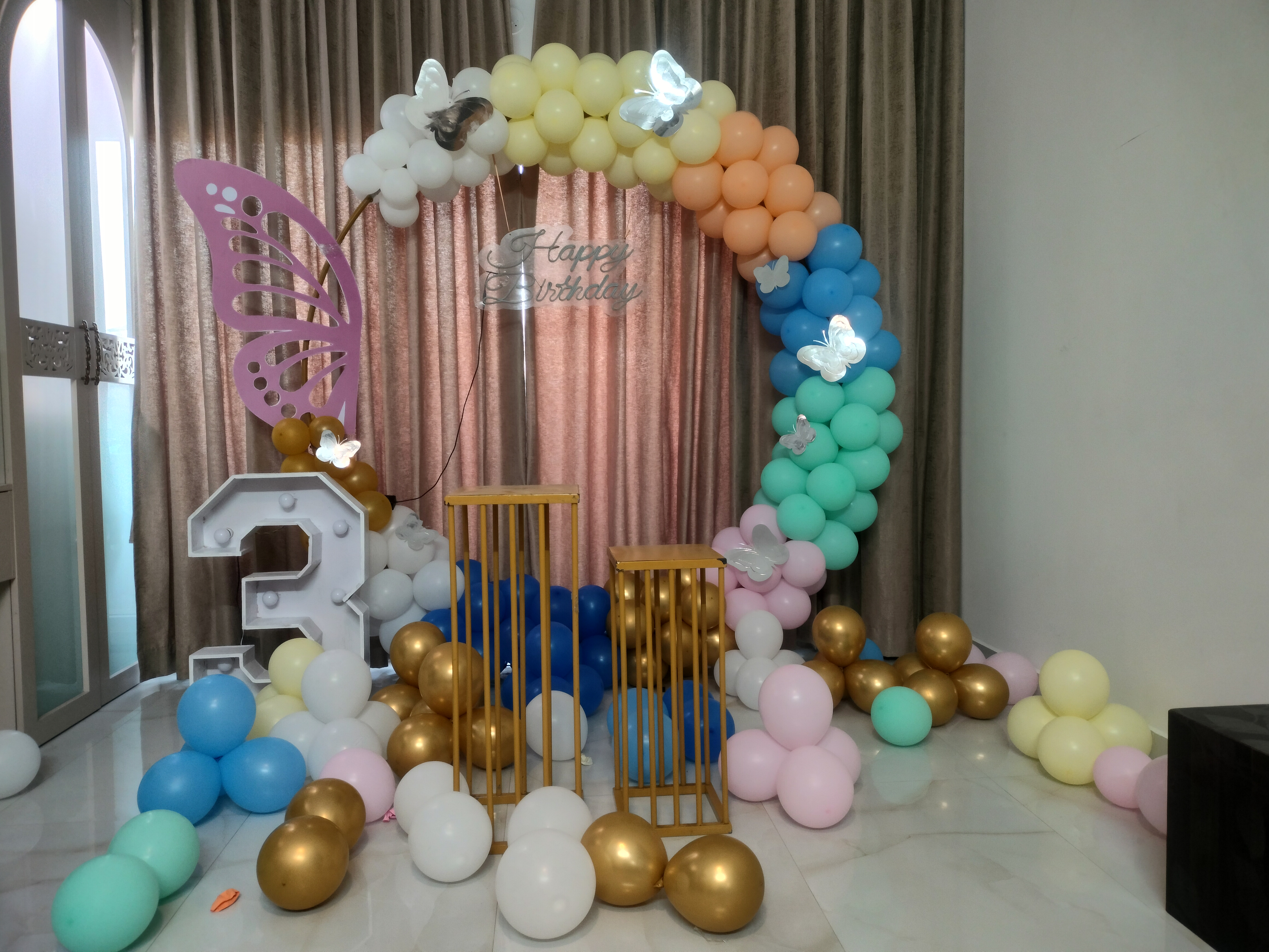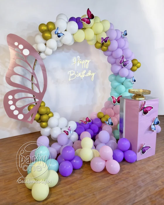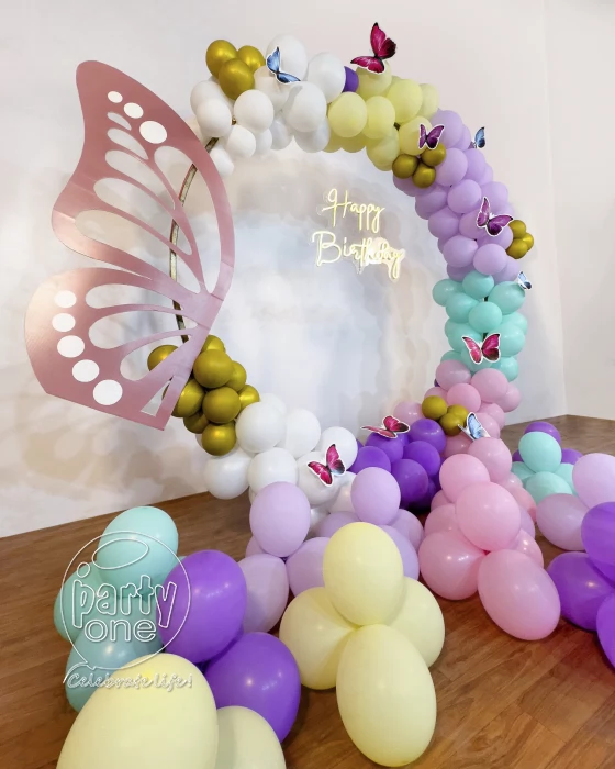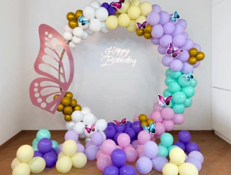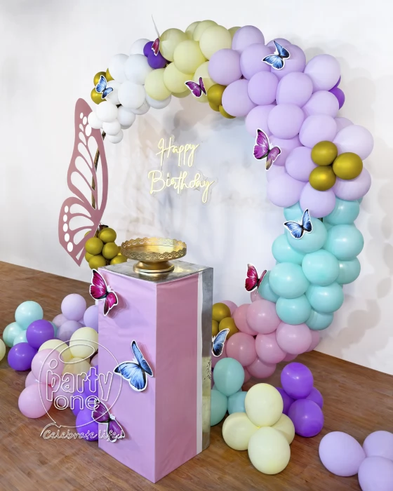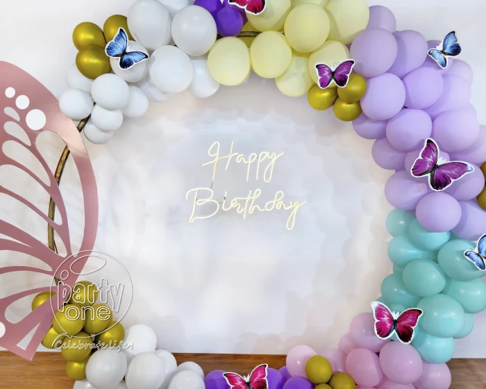 • Searching to throw a birthday party that's as vibrant as a butterfly? Look no further, here is PartyOne’s Vibrant butterfly ring birthday decoration in Thane! Everyone has the dream to catch butterflies, this decoration will let the butterflies flutter around throughout your birthday celebration. PartyOne Balloon decorators have meticulously designed this birthday decoration having the pastel hues in this beautiful balloon ring decoration with pastel yellow, green, white, blue, peach, and gold chrome balloons. A beautiful butterfly sun pack board cutout standing as the heart of decoration. Happy birthday neon light signage that it’s your birthday to the guests, giving them a warm welcoming invite. To complete this look, there are butterfly cutouts fluttering and free-floating balloons around the decoration. For a smooth celebration, have a reliable power supply and allocate PartyOne balloon decorators 3 hours prior to the event for everything to come together.