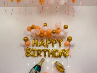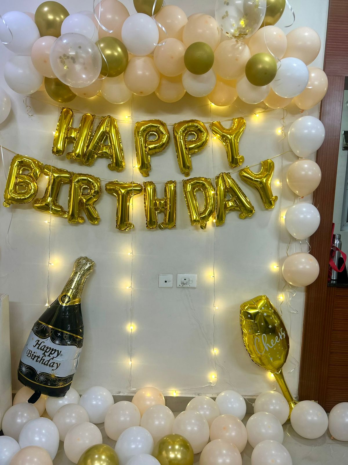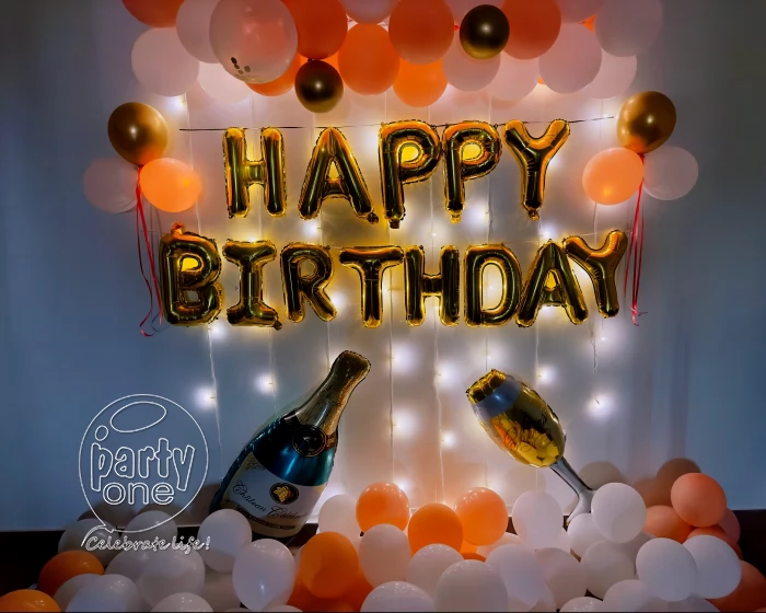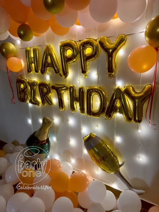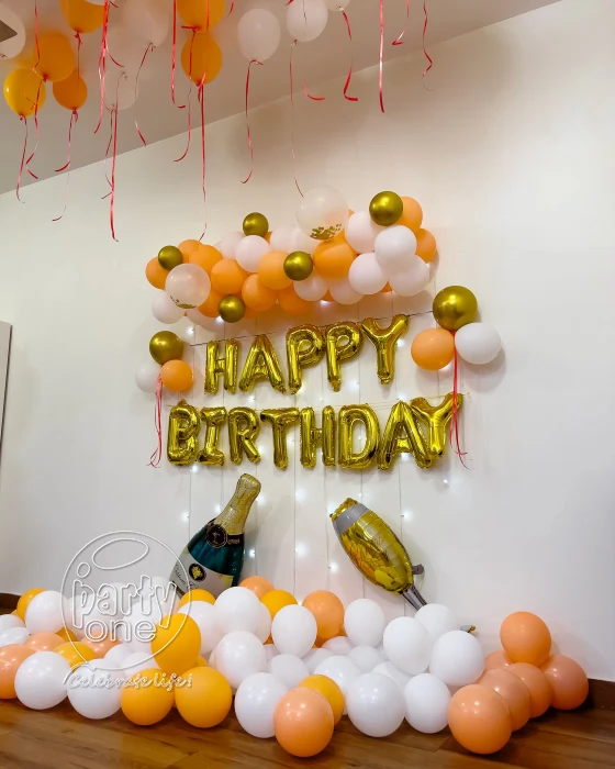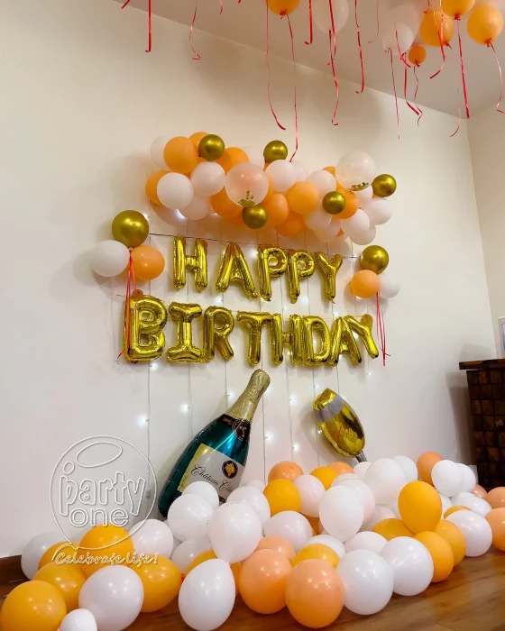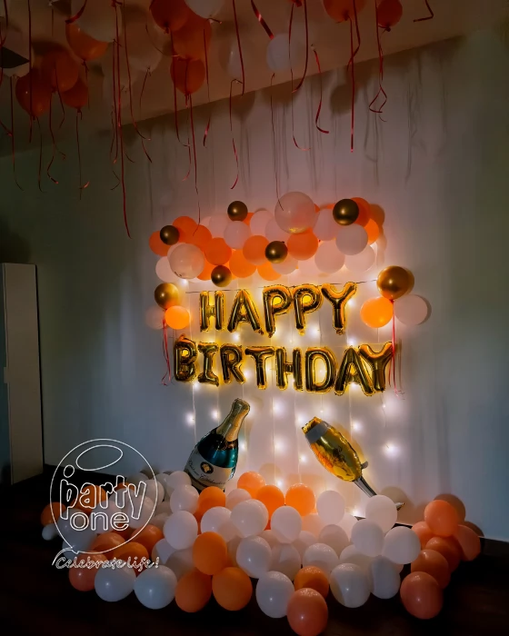 • Getting ready to throw a surprise birthday party? "White & Peach Birthday Surprise Decor" in Thane is perfect to surprise your special someone and watch them light up with joy. PartyOnes decoration services are the perfect way to set up decoration quick and hassle free while ensuring you add a touch of elegance and fun to your celebration. With this decoration you are walking into a room adorned with a beautiful balloon arch, complemented with peach pastel, white, and golden chrome balloons into a stunning centerpiece. For a dash of sparkle Golden confetti balloons are added. Balloons are tied with ribbons for the focal points of decoration. It does not end here, there is more! A giant champagne bottle foil balloon and an equally impressive glass foil balloon screams celebration. Making sure whose special celebration it is, "Happy Birthday" foil balloon ties it all together. Looking up at the ceiling you will find balloons floating with ribbons, while other balloons create a playful carpet on the floor, letting you think of making balloon-angels. For a cozy glow and perfect party pics that will light up for social media is pixel lightings. If you ensure to have a reliable power supply and set aside 3 hours before the event for setup you could enjoy the fabulous surprise ambiance that will leave your special one talk about it for days!