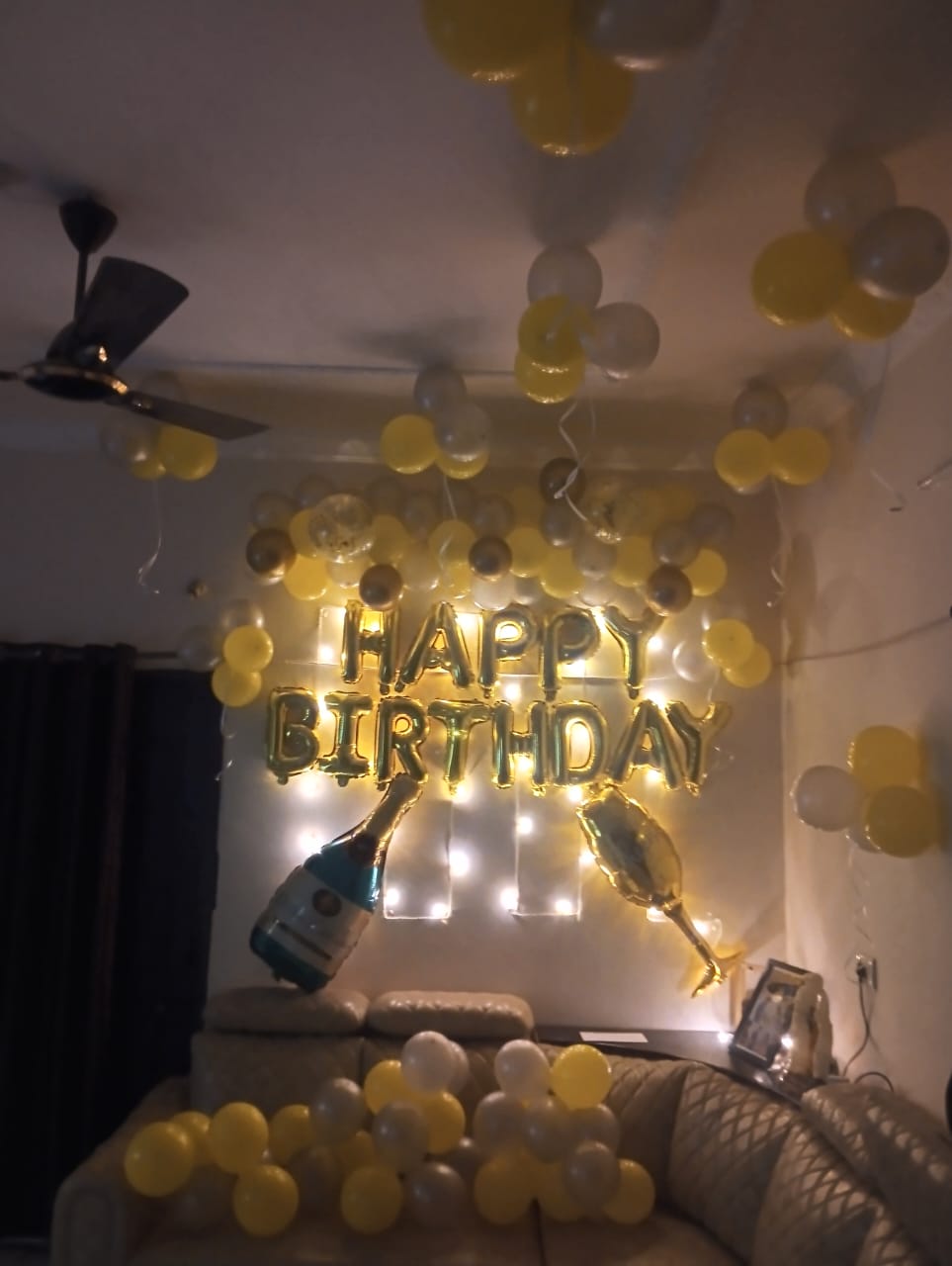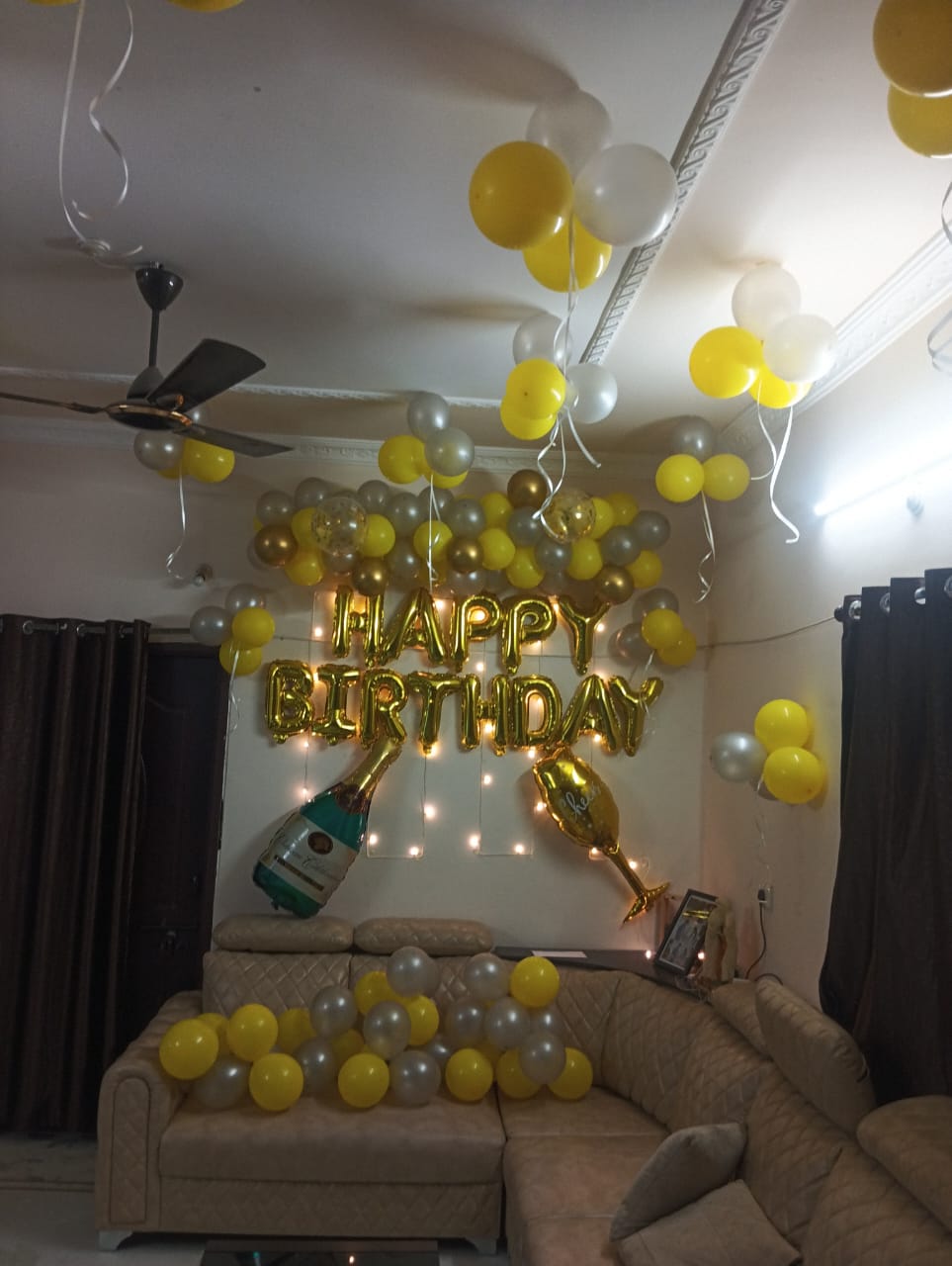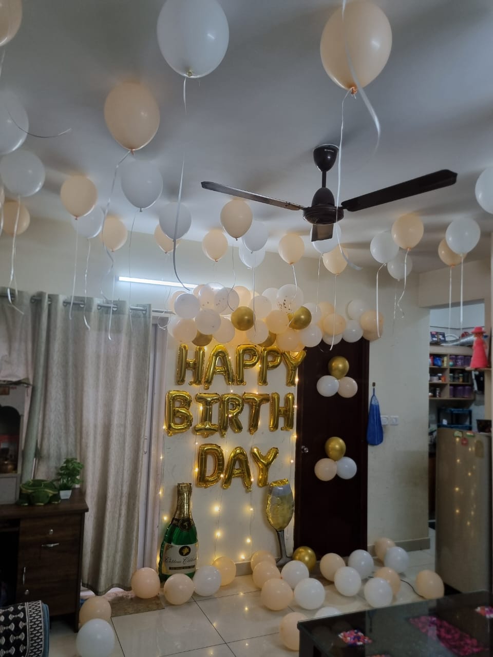 • Getting ready to throw a surprise birthday party? "White & Peach Birthday Surprise Decor" in Thane is perfect to surprise your special someone and watch them light up with joy. PartyOnes decoration services are the perfect way to set up decoration quick and hassle free while ensuring you add a touch of elegance and fun to your celebration. With this decoration you are walking into a room adorned with a beautiful balloon arch, complemented with peach pastel, white, and golden chrome balloons into a stunning centerpiece. For a dash of sparkle Golden confetti balloons are added. Balloons are tied with ribbons for the focal points of decoration. It does not end here, there is more! A giant champagne bottle foil balloon and an equally impressive glass foil balloon screams celebration. Making sure whose special celebration it is, "Happy Birthday" foil balloon ties it all together. Looking up at the ceiling you will find balloons floating with ribbons, while other balloons create a playful carpet on the floor, letting you think of making balloon-angels. For a cozy glow and perfect party pics that will light up for social media is pixel lightings. If you ensure to have a reliable power supply and set aside 3 hours before the event for setup you could enjoy the fabulous surprise ambiance that will leave your special one talk about it for days!