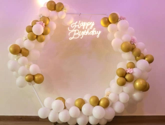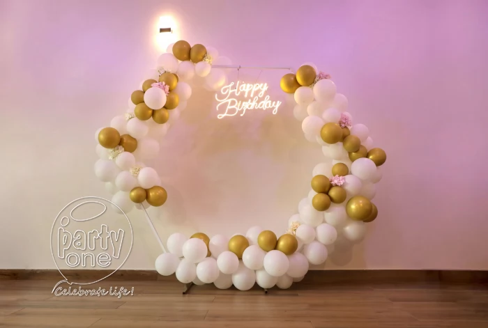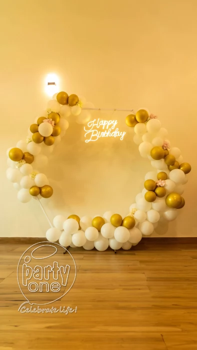• Elevate your birthday celebrations with our PartyOnes’ White Hexagon Birthday Decoration in Thane, specifically designed to create an unforgettable ambiance. This stunning ensemble features a striking hexagon ring and 250 pristine white and chrome gold balloons that would bring elegance into any kind of celebration. There are also 10 exquisite artificial flowers complementing the decoration, adding vibrancy to it. An array of colors from the "Happy Birthday" neon light brightens up the atmosphere, setting a very apt tone for any joyous and festive occasion. This decoration will turn any space—be it a classy meeting or a big bash—attractively into one big party. With this exceptional birthday decoration services, make every moment really unforgettable. For a smooth celebration, have a reliable power supply and allocate PartyOne balloon decorators 3 hours prior to the event for everything to come together.